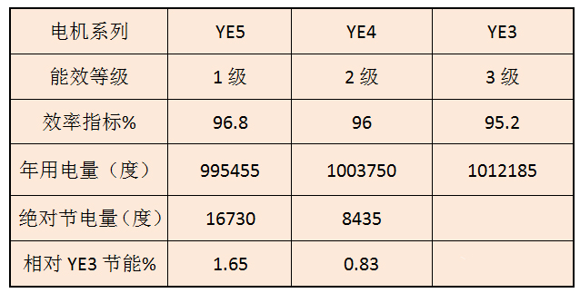 下表對(duì)不同能效等級(jí)電機(jī)的年耗電情況進(jìn)行了對(duì)比,并計(jì)算了YE4和YE5系列電機(jī)相對(duì)于YE3系列電機(jī)的節(jié)電情況。