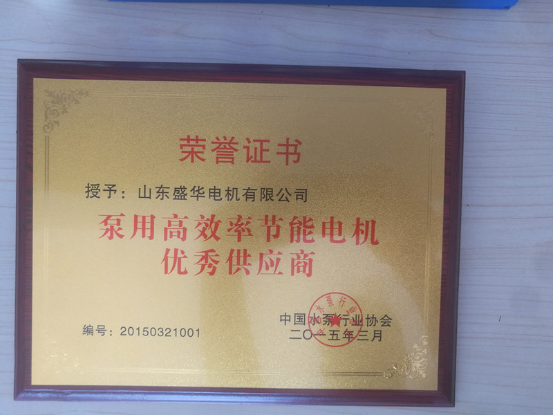 盛華電機(jī)公司資質(zhì)榮譽(yù)《泵用電機(jī)優(yōu)秀供應(yīng)商》