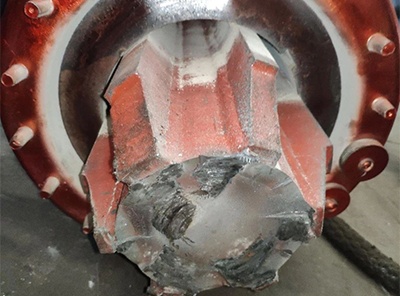 某修理公司承接了一臺(tái)YE3-355-6 380V 50Hz 220kW電機(jī),該電機(jī)實(shí)際配套破碎設(shè)備,軸采用幅板結(jié)構(gòu),斷裂口在軸伸端幅板端部位置,因?yàn)檩S斷裂,電機(jī)已嚴(yán)重掃膛;該電機(jī)采用皮帶輪傳動(dòng),使用20天左右。以下是現(xiàn)場(chǎng)拍到的斷口圖片: