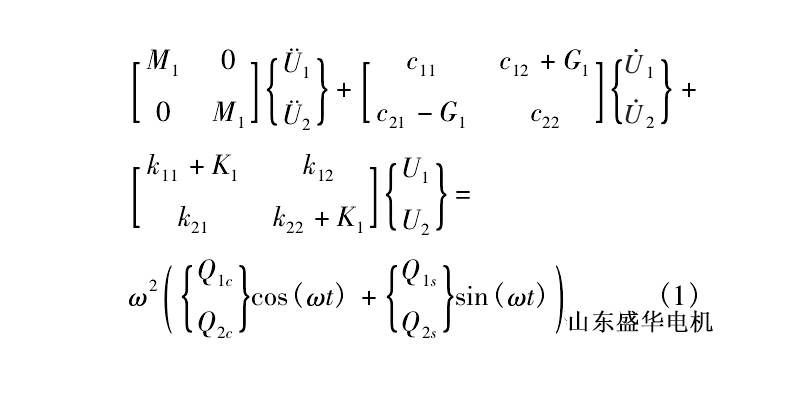 式中,ω—旋轉頻率; M1,K1,G1—整體質量矩陣、剛度矩陣和回轉矩陣; cij,kij( i,j = 1,2) —整體油膜等效阻尼和剛度矩陣; U1,2—系統(tǒng)位移向量,即