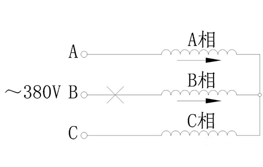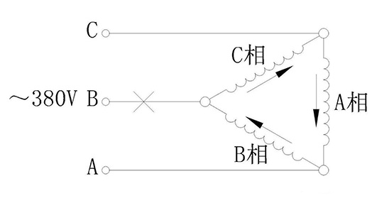 ●如圖2所示, 高效節(jié)能大功率電機(jī)為Y接線,同樣假定B輸入線路斷開(缺B相), A、C兩相繞組實(shí)際串變單相繞組,旋轉(zhuǎn)磁場(chǎng)為橢圓磁場(chǎng),屬于不對(duì)稱運(yùn)行,故相同負(fù)載下,負(fù)載電流將加大,將導(dǎo)致兩相繞組同時(shí)燒壞。